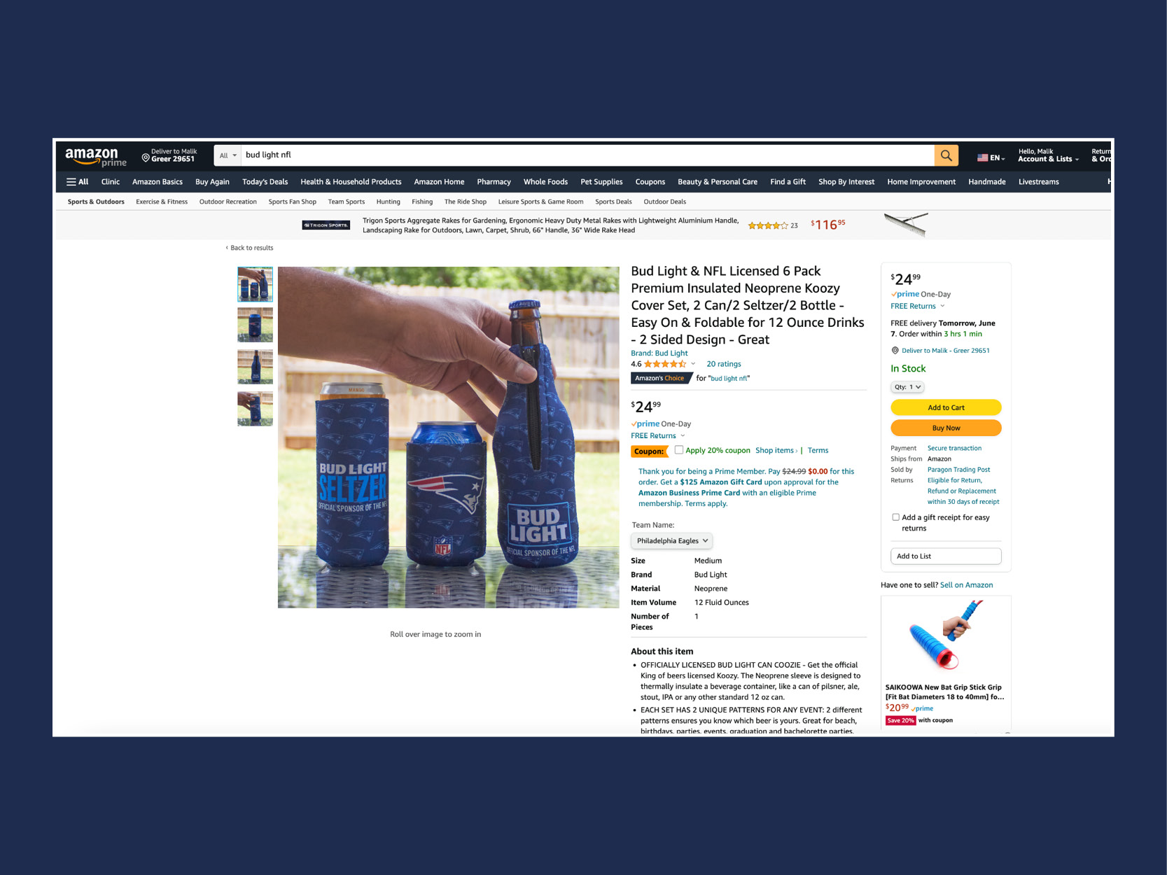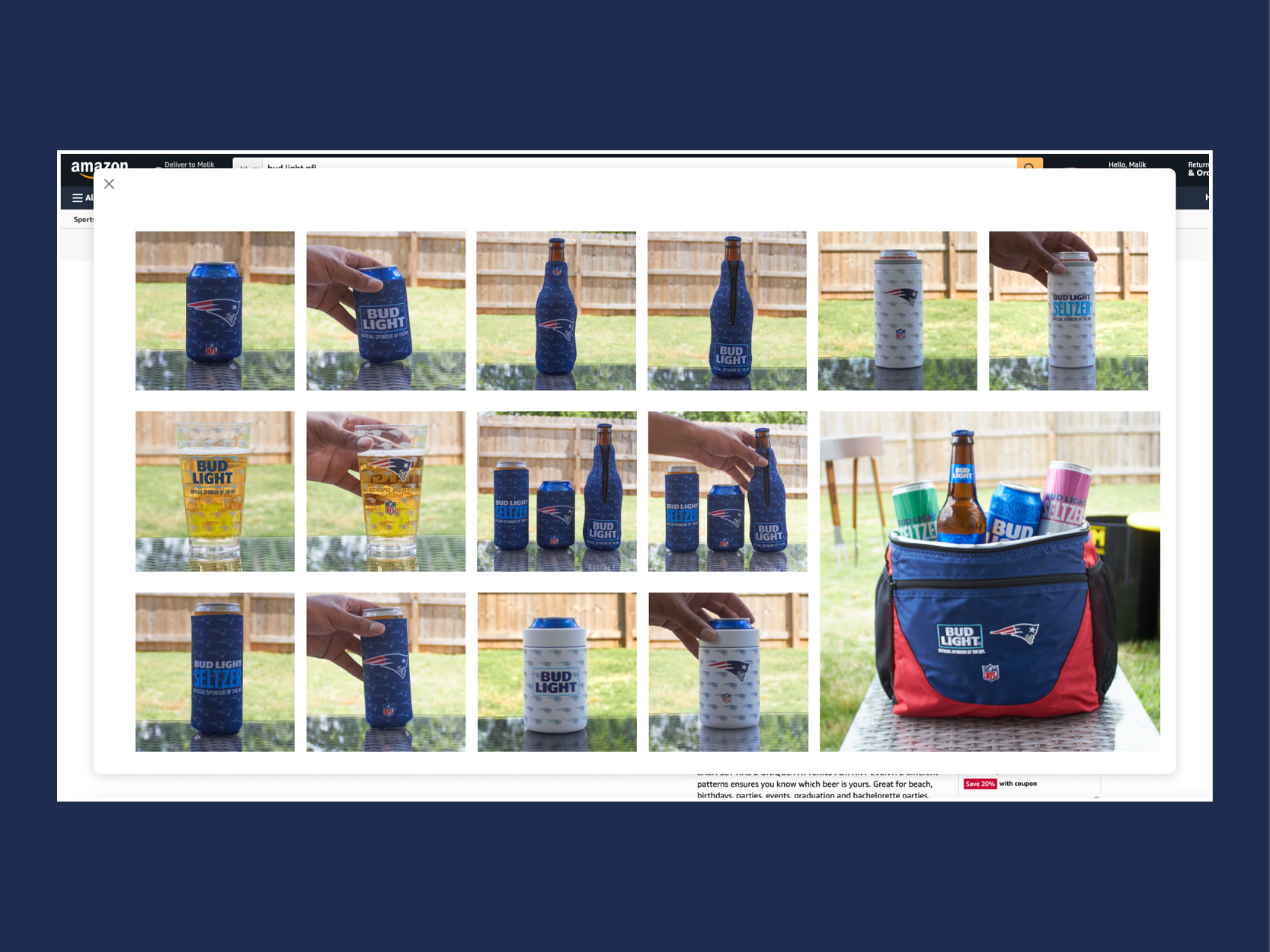 Bud Light partnered with the NFL to create merchandise for DTC placement. Glassware, coolers, coozies and more were created for NFL sports teams to sell on Amazon.